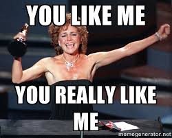 Facebook has also turned us into a nation of Sally Fields. Everywhere I turn, people, organizations, and companies are begging me, yea, bribing me, to like them. “Like us and we’ll give you free stuff,” or, “Like me and you’ll be entered in a sweepstakes.” If we step back and acknowledge this for what it’s saying about our culture, it’s pretty pathetic. In truth, it all makes Ms. Field look downright dignified. At the very least, she was ahead of her time.