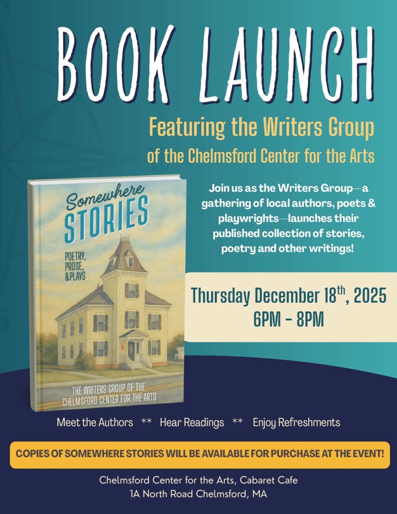 As the flyer above indicates, a book launch will be held next week, on Thursday 12/18/25 at the “somewhere” where we meet, the Chelmsford (MA) Center for the Arts. Feel free to drop by, have some cookies, and check it out.