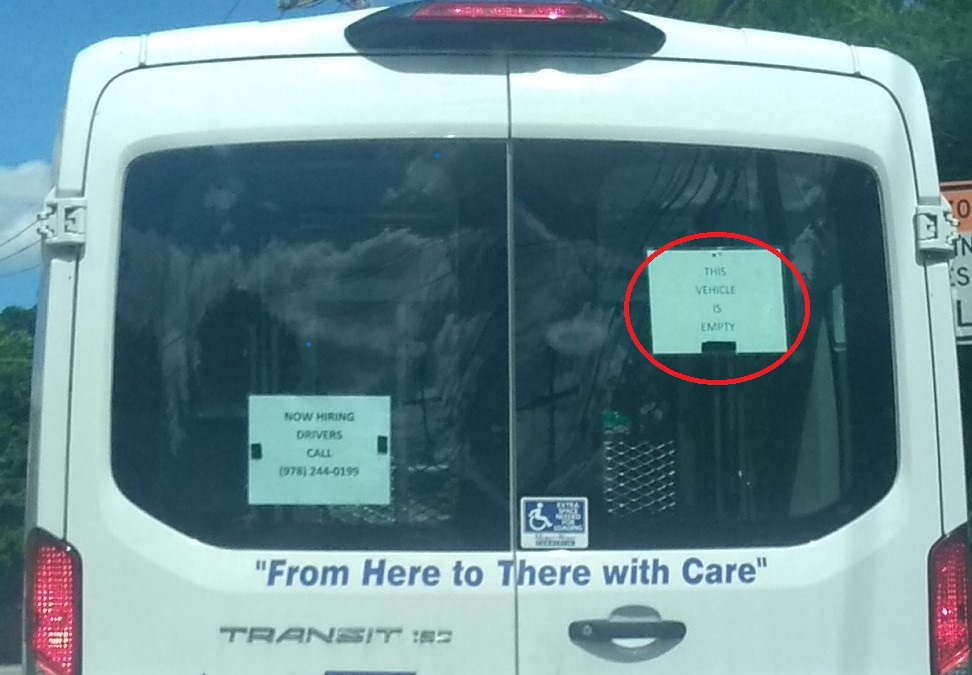 I’m driving behind this van and notice the sign. If it’s empty, who’s driving?!? <cue Twilight Zone theme> Doo-doo-doo-doo.<end theme> This was before self-driving cars. I got off the road immediately.
