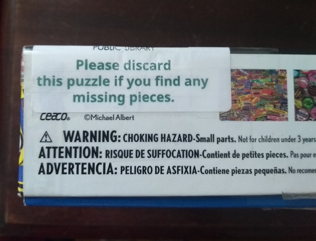 Got this puzzle at the local library. If you find the missing pieces, shouldn’t you keep the puzzle? You’d think a library, of all places would be more precise in its wording.